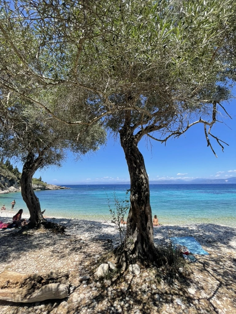 This is a wild beach, so no beach chairs or umbrellas. The path is easily walkable , scenic and took us around 10 minutes to get to the beach. Here you will find natural shade created by the olive trees, it’s very a very beautiful beach.